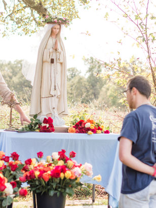 As pilgrims reach the halfway point for Holy Mass on Day 1, they are given a rose to place at the Blessed Mother’s feet.